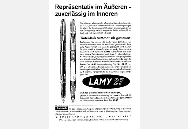 The streamlined LAMY 27 fountain pen, which with its innovative “Tintomatik” system ensures a smooth, clean flow of ink, symbolises the birth of the LAMY writing instrument brand and achieves the firm’s breakthrough on the market.